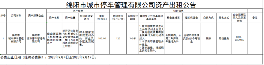 綿陽市城市停車管理有限公司資產(chǎn)出租公告