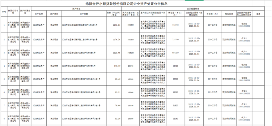 綿陽金控小額貸款股份有限公司企業(yè)資產(chǎn)處置公告信息