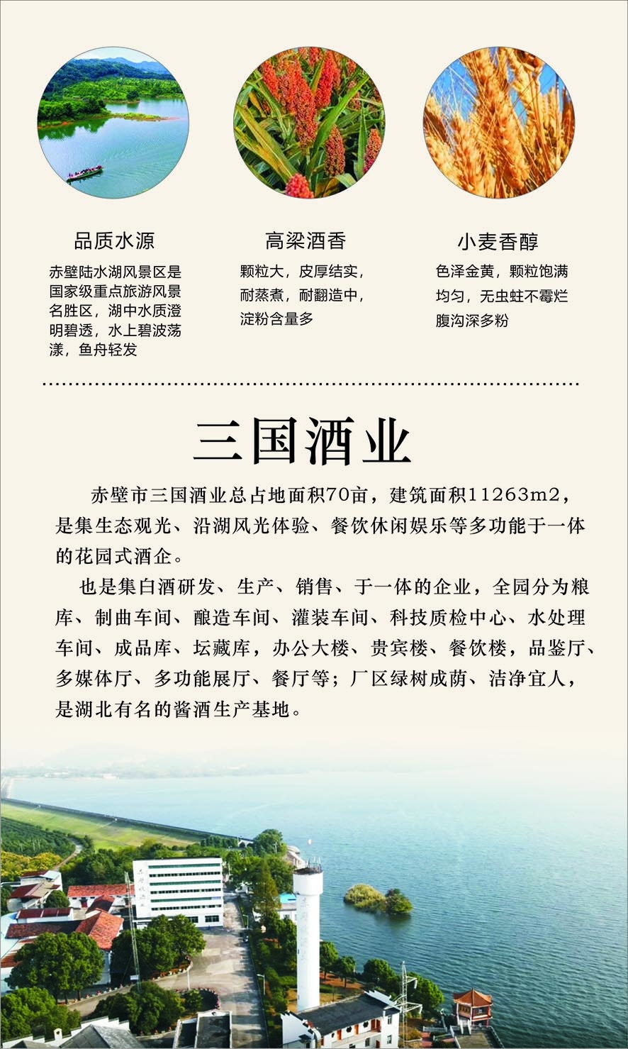 赤壁市三國酒業(yè)有限公司前身為蒲圻酒廠,位于湖北省赤壁市,坐落在國家4A級旅游風(fēng)景區(qū)赤壁市陸水湖畔,風(fēng)景如畫。這里山巒重疊,植被茂盛,丘陵起伏,水系交叉,氣候濕潤怡人,是最適合人居的環(huán)境之一,也為白酒釀造創(chuàng)造了得天獨厚的自然環(huán)境。公司所產(chǎn)的“三國城”家釀?wù)嬲龍猿至?..