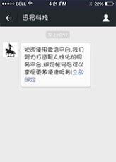 關(guān)注后會(huì)自動(dòng)彈出立即綁定的消息,點(diǎn)擊