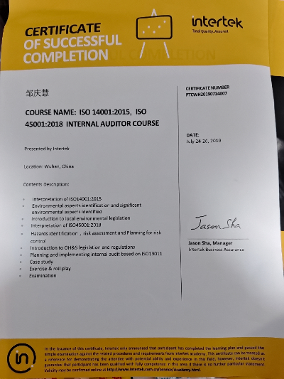 本人有13年的工廠質(zhì)量管理工作經(jīng)驗,精通IQc-Ipqc-FQc-QA全工作流程,五金廠質(zhì)量檢驗標(biāo)準(zhǔn)。熟悉ISO質(zhì)量管理三體系(ISO9001:2015/ISO14001:2015/ISO45001:2018))管理標(biāo)準(zhǔn),能獨立完成公司ISO認證工作,幫助公司建立標(biāo)準(zhǔn)化文件,輔導(dǎo)公司取得ISO證書.